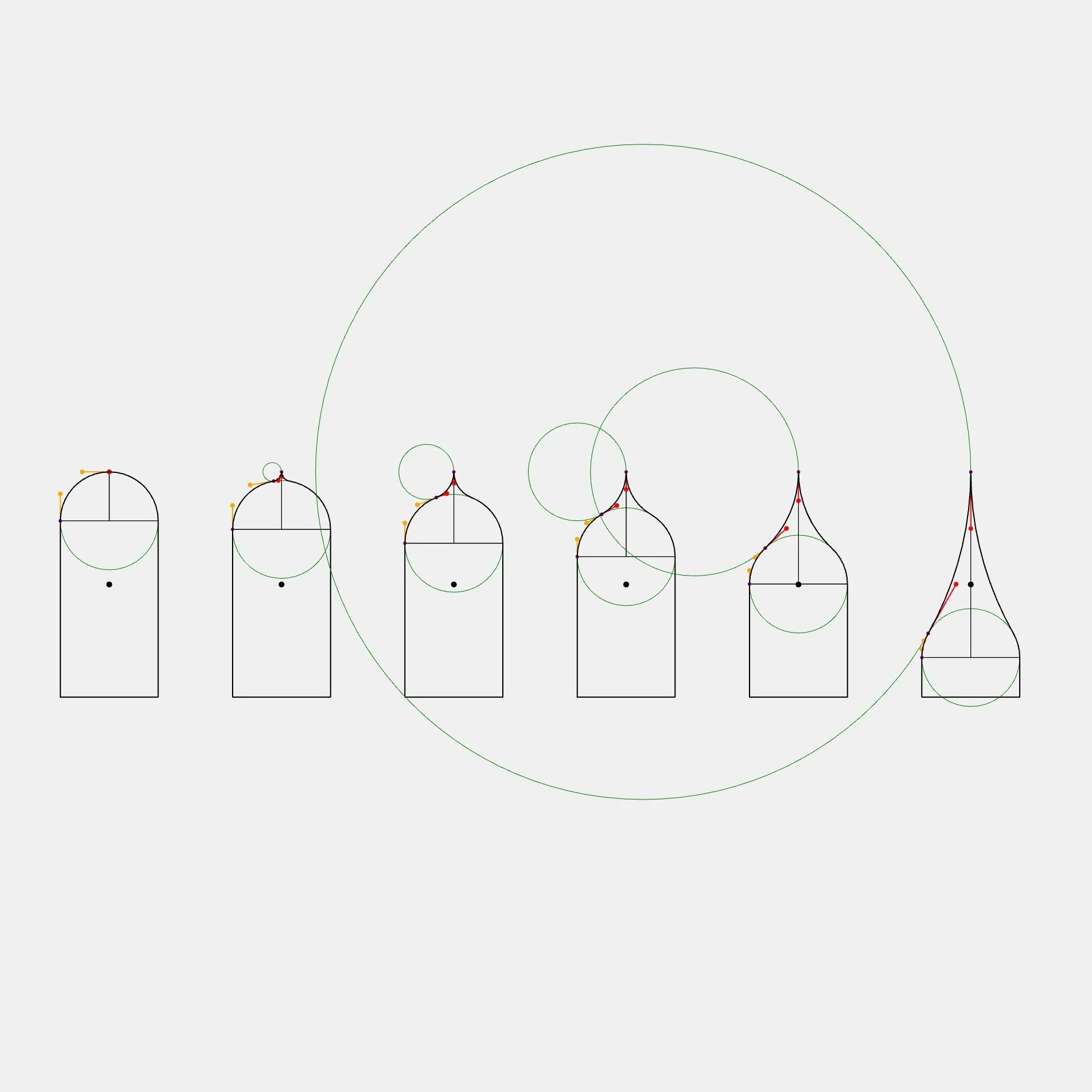 Arch study 2: Ogee arches with varying specification of the inflection point where the two circles making up each arc meet (as you move rightward, the inflection point is shifted further out relative to the center of the arch).