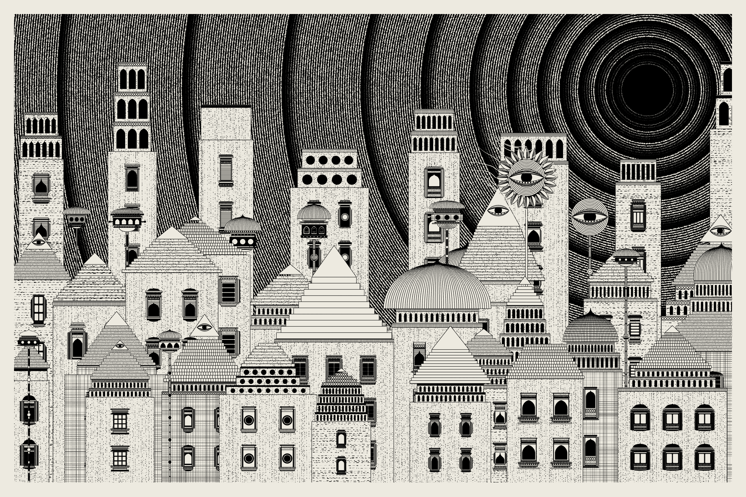 Alan Ki Aankhen #39. The pencil city composition invites you into an alternative universe in which civilizations have elevated pyramids and temples into skyscraper-like structures.
