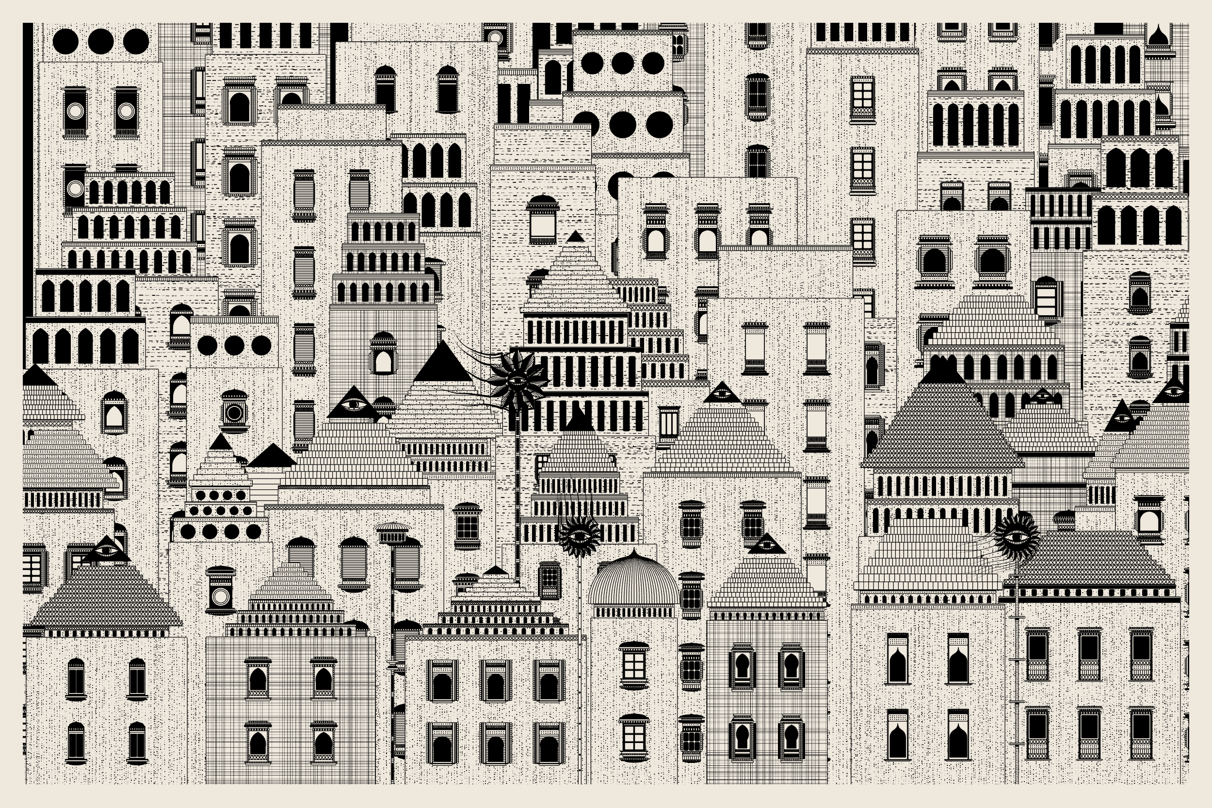 Alan Ki Aankhen #52. The crowded city composition in inspired by the view from a downtown Manhattan apartment: buildings stacked as far as the eye can see.