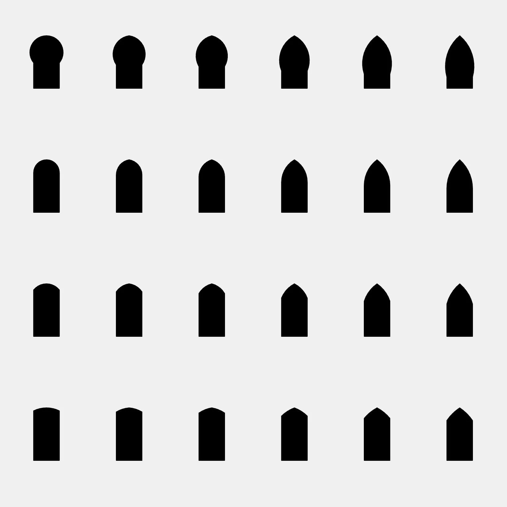 Arch study 1: Pointed two-centered arches with varying placement of the the origin of the circle that makes up each arc (as you move rightward through the columns, the origin is shifted further out relative to the center of the arch; as you move down the rows, the origin is shifted lower).