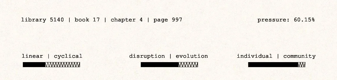 This artwork does not access any outside data, and so is simulating a story governed by my codified rules and randomness. I have modeled a ‘transformation pressure’ that varies from 0% to 100%. The closer the transformation pressure is to 0%, the more the story will focus on indigenous Mesoamerican philosophies: cyclical time, evolution with the land, community-based thinking. And when the transformation is trending towards 100%, the story will focus on modern trends: linear time, disruptive development, individual thinking.